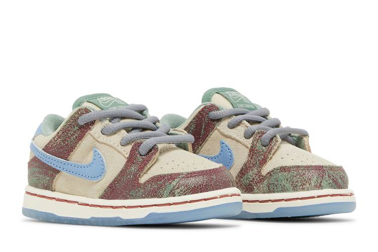 Модель Crenshaw Skate Club x Nike Dunk Low SB TD, созданная для маленьких ножек, посвящена району Лос-Анджелеса, в котором жил основатель CSC Тобиас Макинтош. Пудрово-голубой кожаный Swoosh украшает верхнюю часть из замши цвета загара, укрепленный накладками из потрескавшейся кожи, которые вдохновлены культовым знаком Crenshaw Square. Двойной брендинг Nike и CSC украшает язычок, стельку и пятку. Кроссовки стоят на прочной резиновой подошве с прошитыми боковыми стенками и полупрозрачной резиновой подошвой.