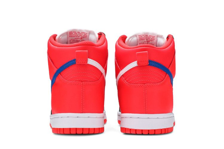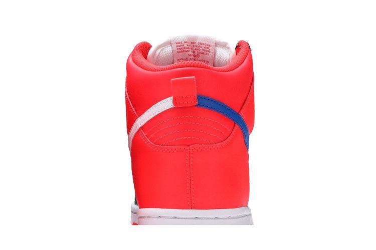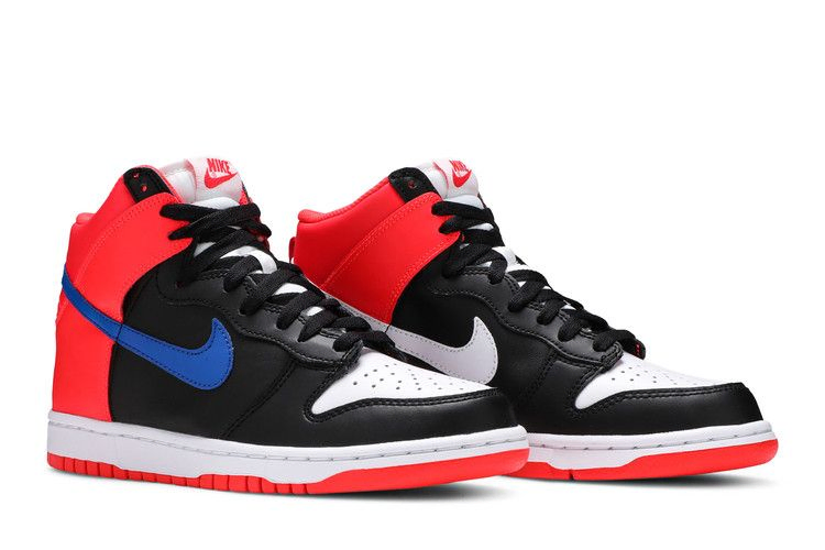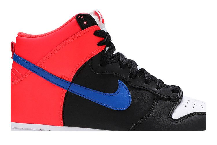 Nike Dunk High GS "Knicks" выполнены в знакомой палитре, напоминающей о цветах знаменитой нью-йоркской франшизы NBA. Кожаный верх имеет черную основу с белой перфорацией на носке и смелыми вкраплениями ярко-малинового цвета на воротнике и пятке. Фирменный логотип Swoosh выполнен в королевском синем цвете на латеральной стороне и белом на медиальной стороне. Брендинг Nike расположен на носочной части, а тканая бирка - на нейлоновом язычке с легкой подкладкой. Стандартная двухцветная резиновая подошва поддерживает силуэт.