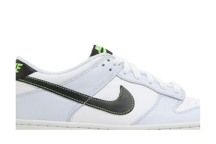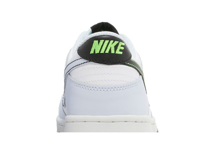 Модель Nike Dunk Low GS "Grey Green Strike", представленная в школьном размере, демонстрирует несочетаемые Swooshes. Черный Swoosh с контрастной зеленой строчкой украшает латеральную сторону кожаного верха, имеющего белую основу с бледно-серыми накладками на носке и пятке. Медиальная сторона отмечена серым логотипом Swoosh с контрастной черной строчкой. Брендинг Nike украшает язычок и задник ярким зеленым оттенком. Подошва из черной резины обеспечивает надежное сцепление с поверхностью.