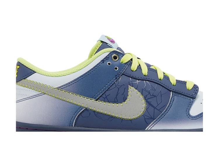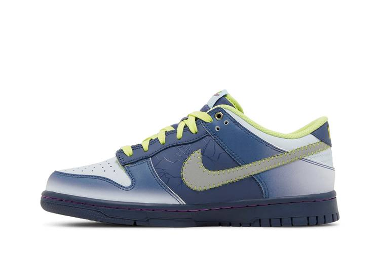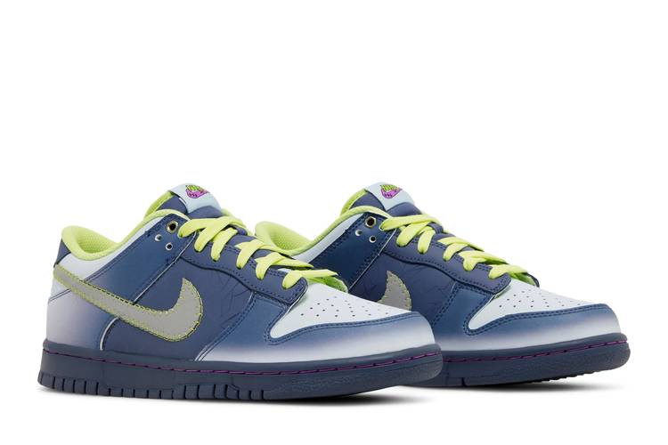 Созданные для больших детей, Nike Dunk Low GS "I am Fearless!" празднуют Хэллоуин чудовищными деталями, включая болты с люверсами и светоотражающий матово-серебристый Swoosh, простроченный желтой строчкой. Верх из гладкой кожи закреплен шнурками Luminous Green и украшен тональной отделкой разных оттенков синего. На внутренней стороне тканого язычка Nike красуется надпись "I Am Fearless!". Кроссовки поддерживаются темно-синей резиновой подошвой с контрастной строчкой цвета фуксии.