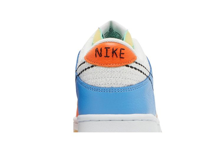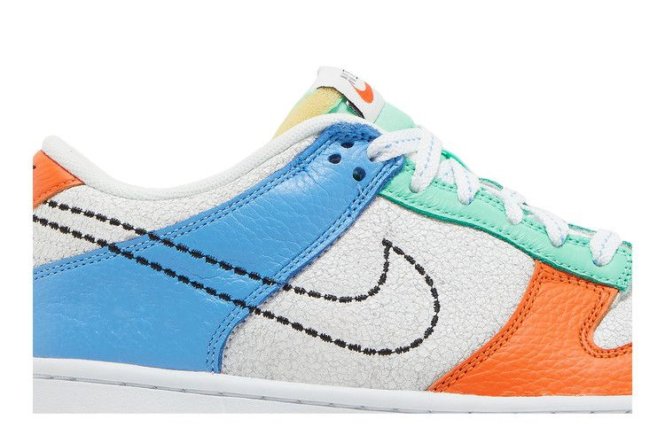 Nike Dunk Low GS "Nike 101" - это яркие оттенки в эксклюзивном детском варианте силуэта. Верхняя часть из белой кожи с трещинами дополнена накладкой Green Glow и накладками из кожи синего и оранжевого цветов. Черная вышивка украшает фирменный логотип Swoosh, а также знак Nike, украшающий выступ на пятке. На носках красуется фирменная надпись "Nike 101". Подошва из полупрозрачной резины обеспечивает надежное сцепление с поверхностью.