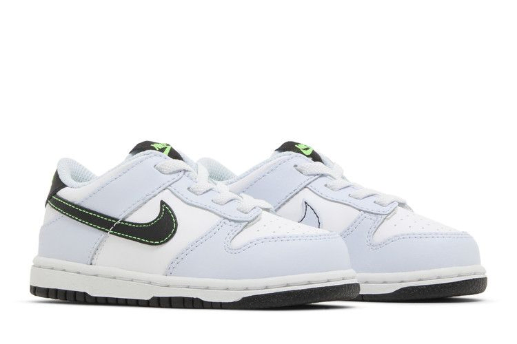 Nike Dunk Low TD "Grey Green Strike" - это двухцветные кожаные кроссовки белого и серого цветов, украшенные несовпадающими цветами Swooshes: серым с черной строчкой на медиальной стороне и черным с неоново-зеленой строчкой на латеральной стороне. Ярко-изумрудный оттенок повторяется на брендинге Nike на язычке и заднике. Эластичные шнурки без завязок обеспечивают легкое надевание и снимание, а прочная резиновая подошва обеспечивает надежное сцепление с поверхностью.