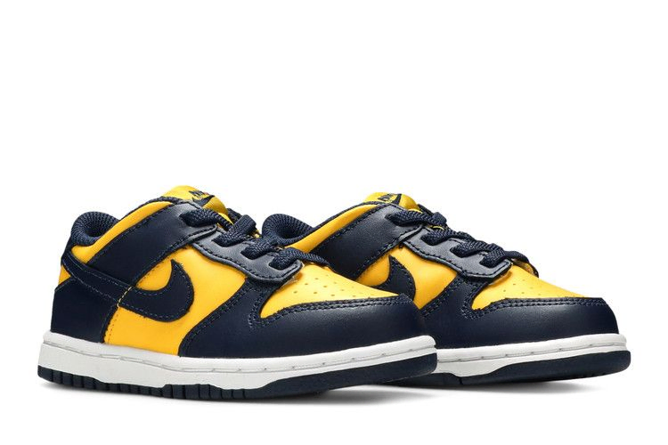 Выпуск 2021 года Nike Dunk Low TD "Michigan" возвращает оригинальную расцветку из культовой серии 1985 года "Be True to Your School". Кроссовки, выполненные в форме лоу-топа и предназначенные для нового поколения фанатов "Росомах", имеют двухцветный кожаный верх Varsity Maize и Midnight Navy. Неизменными остались такие детали, как тканый язычок Nike, перфорированные детали на носке и вышитый знак Nike на язычке пятки. Прочная резиновая подошва обеспечивает надежное сцепление с поверхностью для растущих ног.