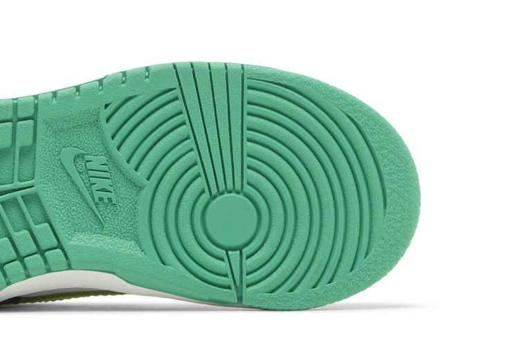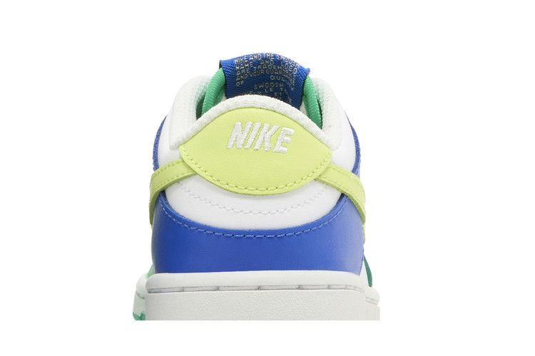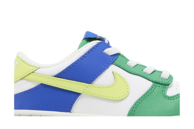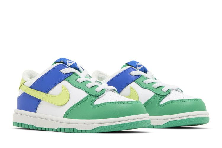 Nike Dunk Low TD "Stadium Green Royal" с кожаным верхом на эластичных шнурках без завязок, с белой основой и накладками на носке и пятке зеленого и синего цветов. Контрастный цвет Lemon Twist украшает фирменную надпись Swoosh и задник с логотипом Nike. Прочная подошва с белыми боковыми стенками и зеленой резиновой подошвой удерживает низкие кроссовки.