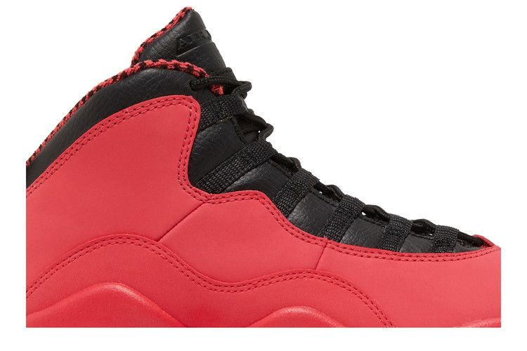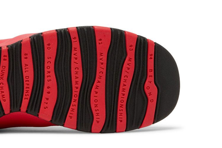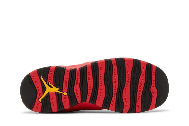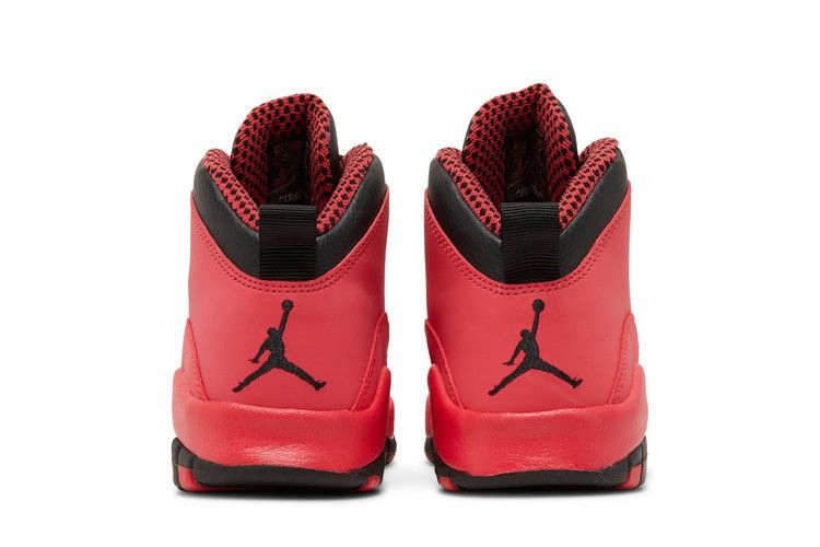 Созданная для девочек, эта школьная версия Jordan 10 имеет кожаный верх черного, красного и оранжевого цветов. Изначально модель AJ10 была выпущена к сезону 1994-1995 годов, когда Джордан променял баскетбол на бейсбол, и служит данью уважения к начальной главе наследия Джампмена в НБА. На подошве расположены надписи, перечисляющие 10 вех ранней карьеры MJ.