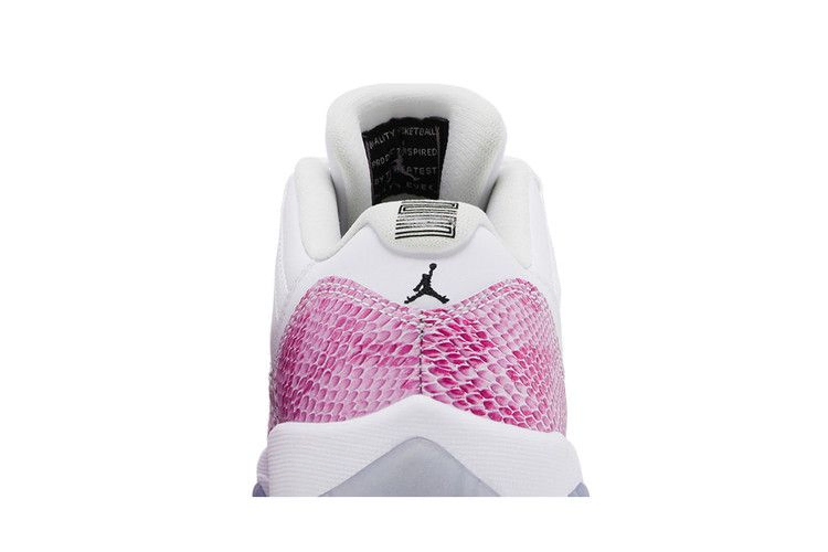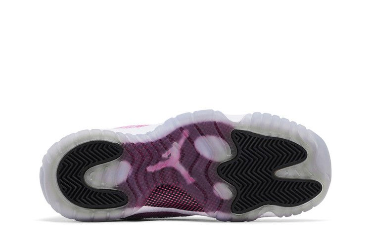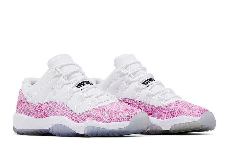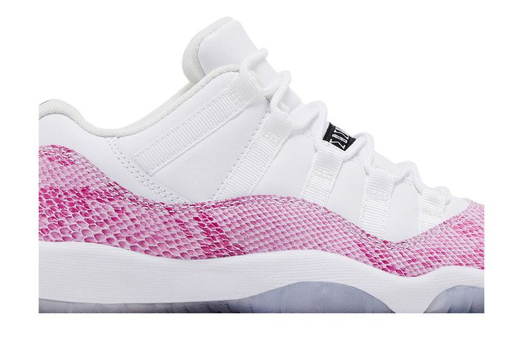 В этом ретро-издании Air Jordan 11 панели из лакированной кожи, использовавшиеся в модели OG 1995 года, были заменены на отделку из искусственной змеиной кожи. Светло-розовая накладка на низких кроссовках для девочек разделила место с кожаной конструкцией на остальной части верха. Полупрозрачная подошва льдисто-голубого цвета добавляет тонкий акцент, а на язычке и пятке красуется черный фирменный знак Jordan.