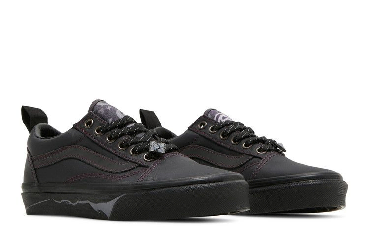 В модели Vans Harry Potter x Old Skool Kids 'Deathly Hallows', украшенной индивидуальными деталями, используется каждый сантиметр классического силуэта, чтобы подчеркнуть это причудливое партнерство. Выпущенные в июне 2019 года, эти детские кеды имеют верх из текстиля и синтетики, а глубокая фиолетово-красная строчка подчеркивает цвет преимущественно черного материала. Магический рисунок на язычке и шарм Deathly Hallows на шнурках выделяются на фоне сдержанной цветовой гаммы.