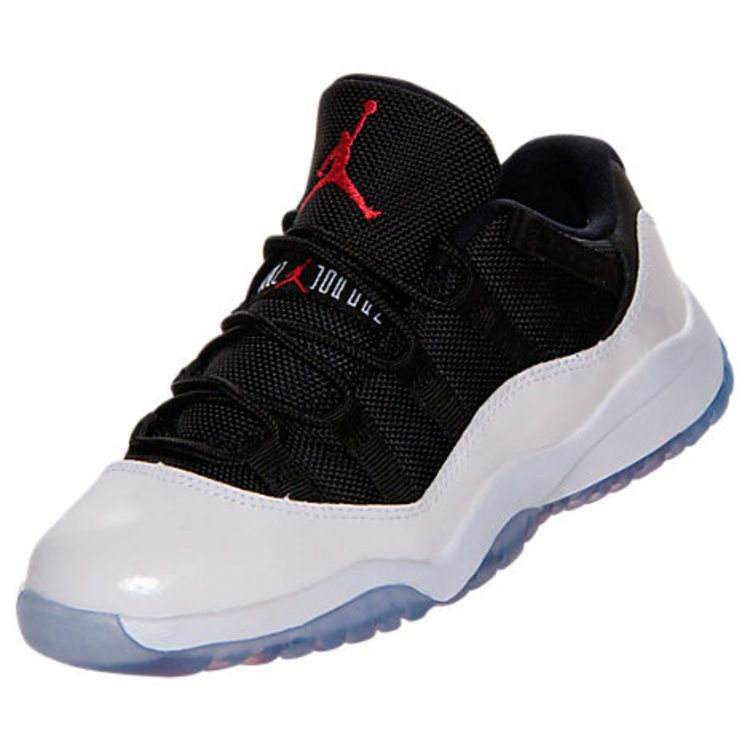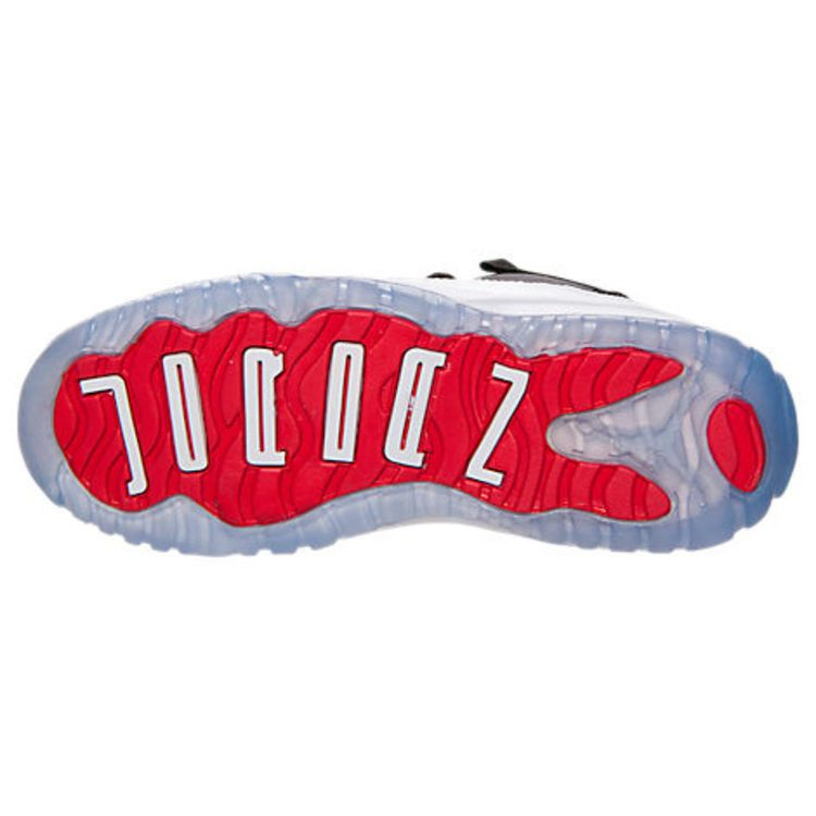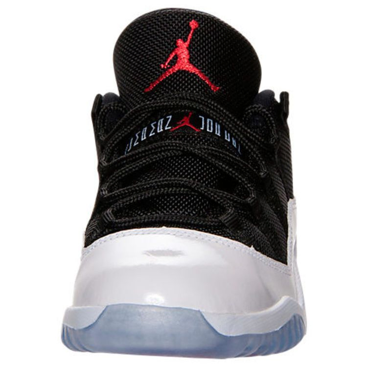 Это дошкольное издание Air Jordan 11 Retro Low, появившееся в магазинах в июне 2013 года. Низкие кроссовки выполнены в простой двухцветной композиции: верх из черной баллистической сетки с черным язычком и шнурками, дополненными накладкой из лакированной кожи белого цвета. Легкая подошва из вспененного материала усилена ледяной полупрозрачной подошвой с контрастными красными резиновыми вставками.