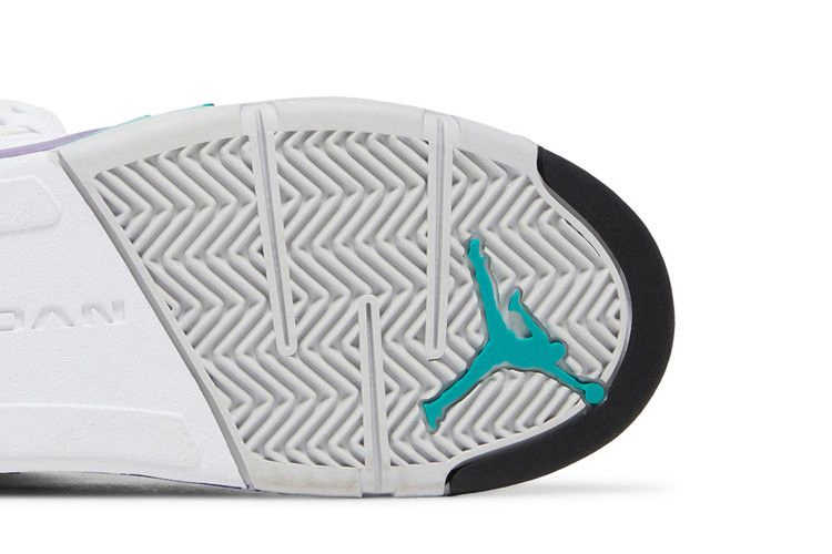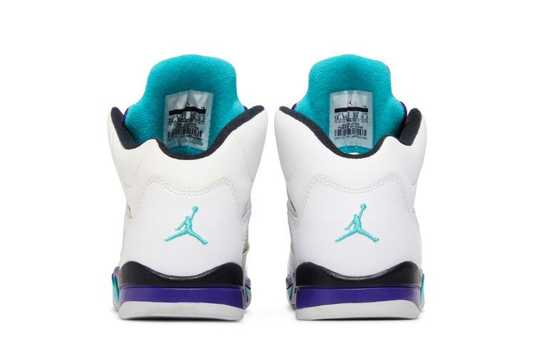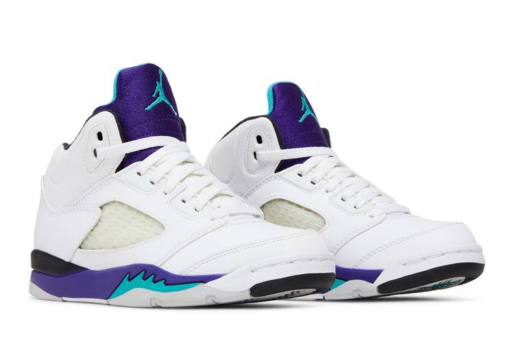Знаковая модель Jordan 5 Майкла Джордана появилась в детском размере в классическом цветовом решении "Grape". Верх кроссовка выполнен из белой кожи премиум-класса и украшен цветами New Emerald и Grape Ice. В этой версии также используется неопреновый язычок, а на межподошву нанесен рисунок в виде акульего зуба, вдохновленный самолетами Второй мировой войны.