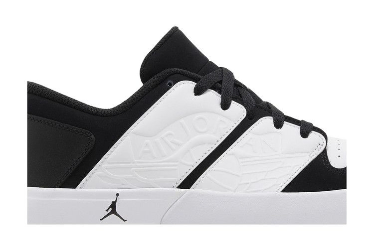 Созданные для больших детей, Jordan NU Retro 1 Low GS "White Black" сочетают в себе черную нубуковую основу с белой кожей на носочной части, а также пару средних панелей стопы с тисненым логотипом Wings большого размера на боковой стороне. Брендинг Jumpman присутствует на шнуровке, носочной части и межподошве. Черная резиновая подошва с рисунком сцепления позаимствована у оригинальных Air Jordan 1.