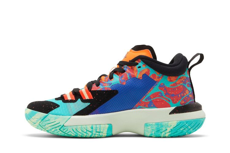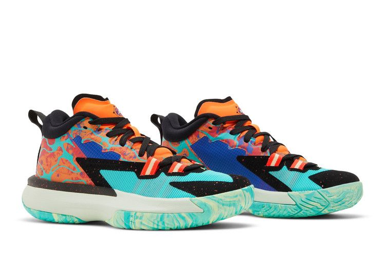 Созданные для больших детей, Jordan Zion 1 GS 'Project Z' демонстрируют многоцветный дизайн, отражающий динамичный стиль игры Зиона Уильямсона. Верхняя часть из легкой сетки и синтетических материалов выполнена в калейдоскопическом сочетании оранжевых, тиловых и королевских синих тонов. Воротник с мягкой подкладкой обеспечивает удобную посадку, а внутренние ремешки, интегрированные в шнурки, - повышенную фиксацию и стабильность. Полноразмерная подошва из материала Phylon снабжена встроенным блоком Nike Air для легкой амортизации.