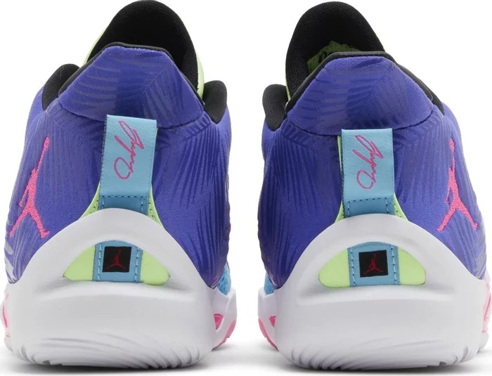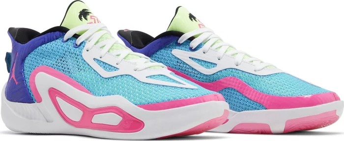 Air Jordan Tatum 1 GS Wave Runner - это первые фирменные кроссовки Джейсона Тэйтума для подростков, выполненные в оригинальной цветовой гамме. Воздушная голубая сетка с розовыми акцентами использована в легком верхе, усиленном каркасом из TPU, который избавляет от необходимости использовать лишние материалы. На язычке вышит личный логотип Тэйтума, а на боковине пятки - тисненый логотип Jumpman. В передней части подошвы размещен большой блок Zoom Air из пеноматериала, обеспечивающий пружинистую амортизацию и отзывчивость на корте.- Цвета: Lagoon Pulse/Pink Blast/Psychic Purple/White/Lime