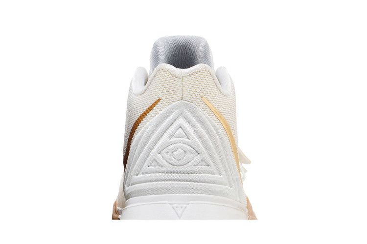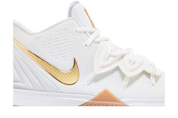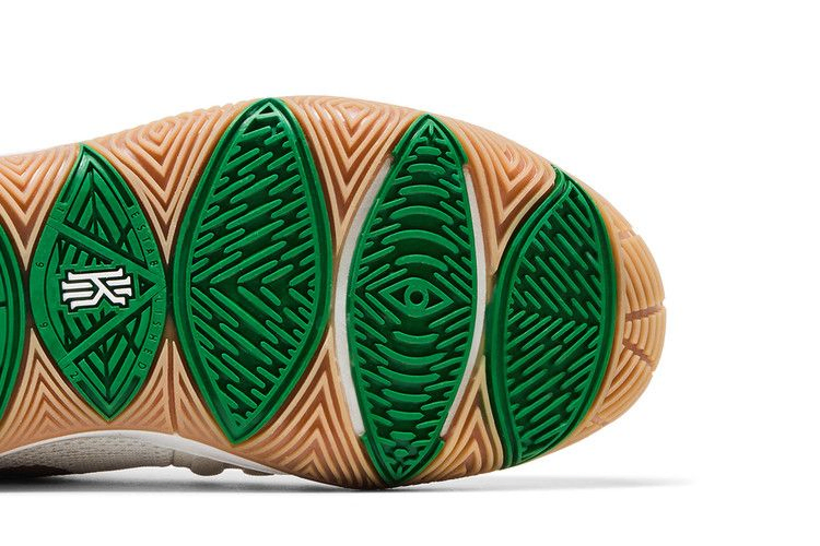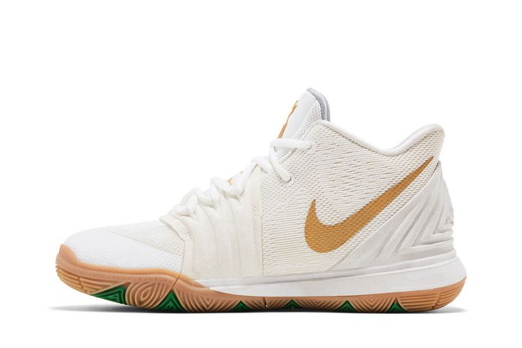 Кроссовки Nike Kyrie 5 GS "Irish", созданные исключительно для детей, имеют ирландскую расцветку и полностью белый сетчатый верх, украшенный золотистым брендингом на язычке и боковине. Накладка в виде мухоловки в средней части стопы помогает закрепить систему фиксации Flywire, а обновленная амортизация Air Zoom Turbo сочетается с изогнутой формой подошвы из резины с высоким коэффициентом сцепления. Рисунок подошвы, основанный на татуировке "рука Хамсы", выделен зеленым цветом Boston Celtics.