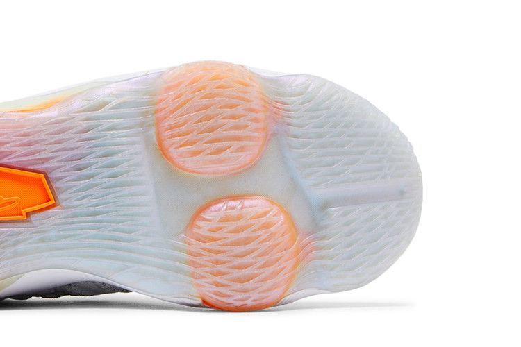 Nike Lebron 17 BG "Future Air", предлагаемые в молодежном размере, представляют собой дебютную расцветку семнадцатых фирменных кроссовок Леброна Джеймса. Верхняя часть из трикотажа нейтрального серого цвета сочетает в себе дышащую конструкцию Flyknit с термоформованными нитями для дополнительной прочности. Радужные детали украшают язычок и промежуточную подошву, на которой размещены объемный блок Max Air в пятке и блоки Zoom Air в носочной части. Подошва из полупрозрачной резины обеспечивает надежное сцепление с поверхностью.