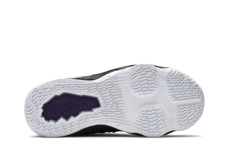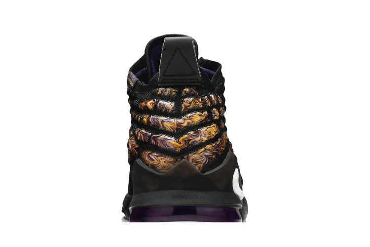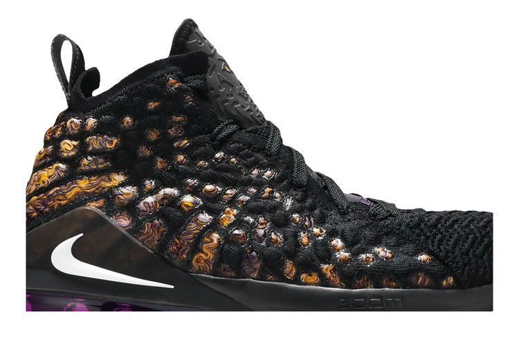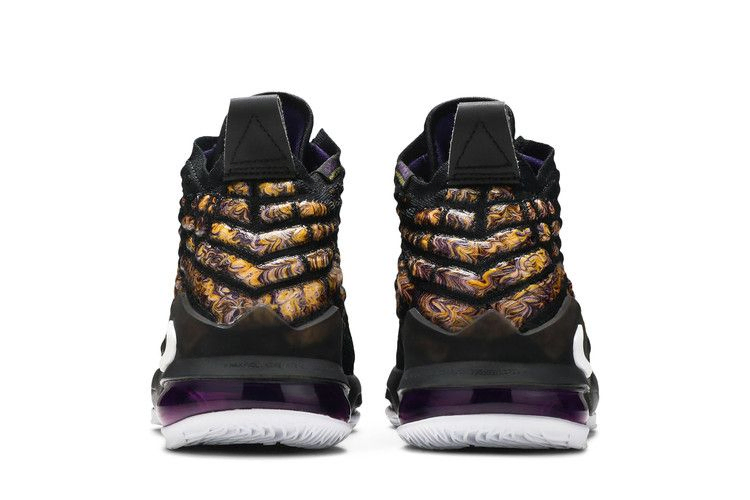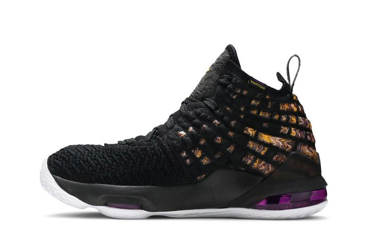Модель Nike LeBron 17 BG "Lakers", созданная для больших детей, отличается выразительной цветовой гаммой, вдохновленной знаменитой франшизой НБА в Лос-Анджелесе. Верхняя часть из трикотажа Knitposite, сочетающая черную трикотажную основу с термоформованными нитями пурпурного и золотого оттенков, имеет светоотражающие детали 3M на язычке и язычке пятки. Верхняя часть кроссовка опирается на упругую подошву из пеноматериала, а в пятке размещен фиолетовый блок Max Air. На носках нанесена надпись "LeBron James" фирменным шрифтом Lakers.