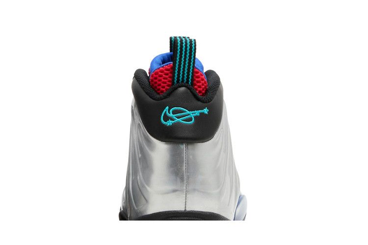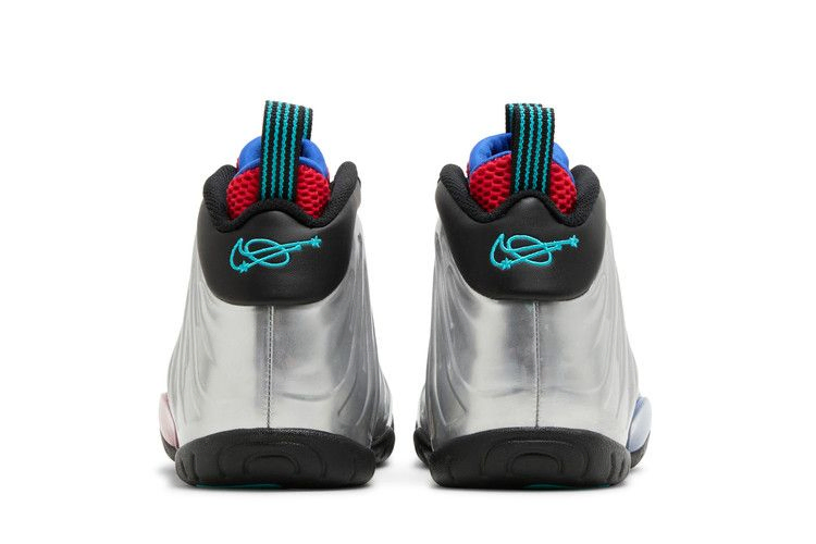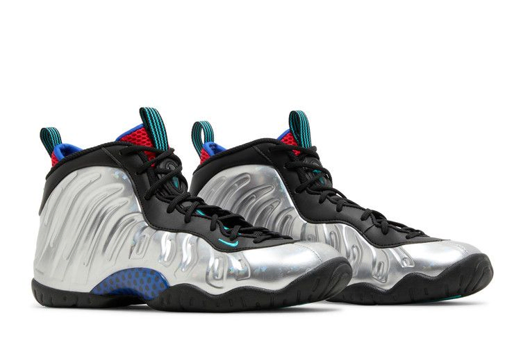 Модель Nike Little Posite One "All-Star 2024" имеет серебристо-металлическую отделку верха Foamposite, контрастирующую с черной кожаной отделкой на наглазнике и воротнике. На язычке использована воздухопроницаемая красная сетка, а полосатые акценты цвета тила расположены на черной тесьме на язычке и пятке. Подошва из черной резины имеет сцепление с поверхностью в виде елочки и малиновую пластину на голенище.