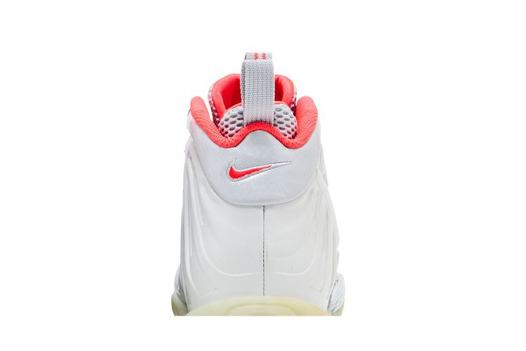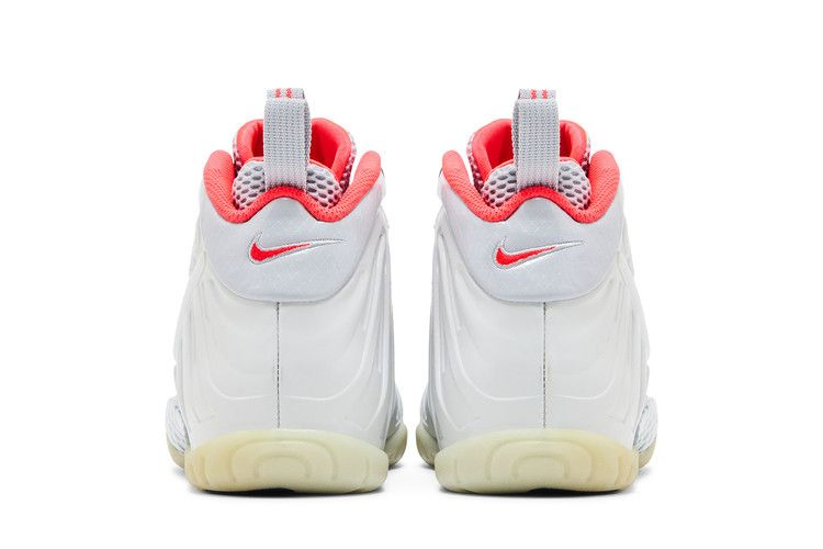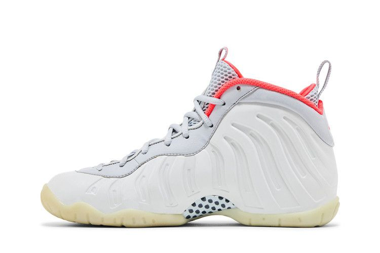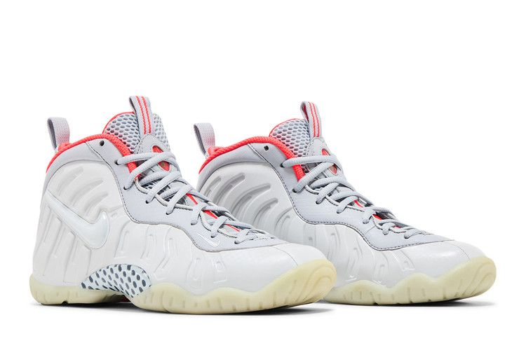Эта модель Little Posite Pro GS в цвете "Pure Platinum" выполнена в волчье-серой цветовой гамме, дополненной ярко-малиновым цветом на подкладке и едва заметным зеленым оттенком под подошвой. Эта пара была выпущена в марте 2016 года, после чего появились сопутствующие варианты Foamposite Pro в цветах "Solar Red" и "Red October".