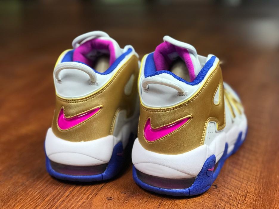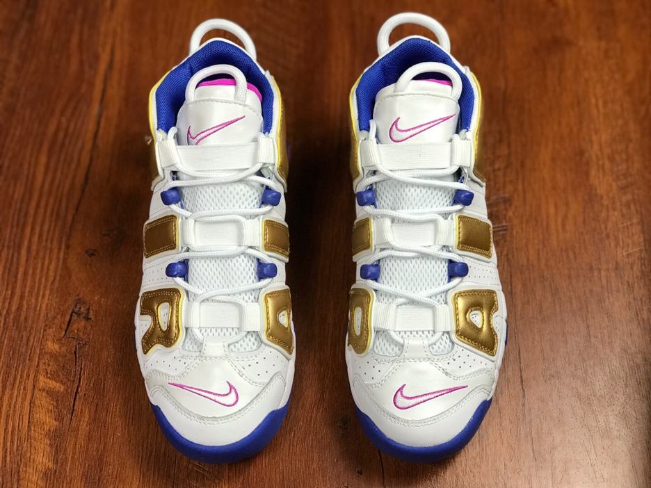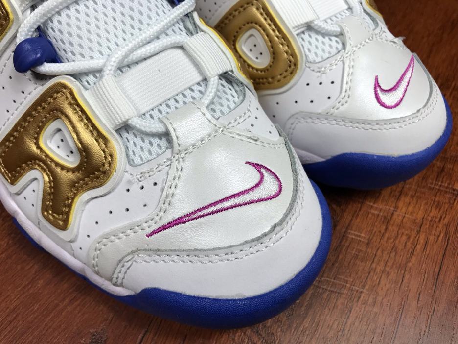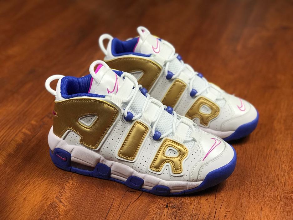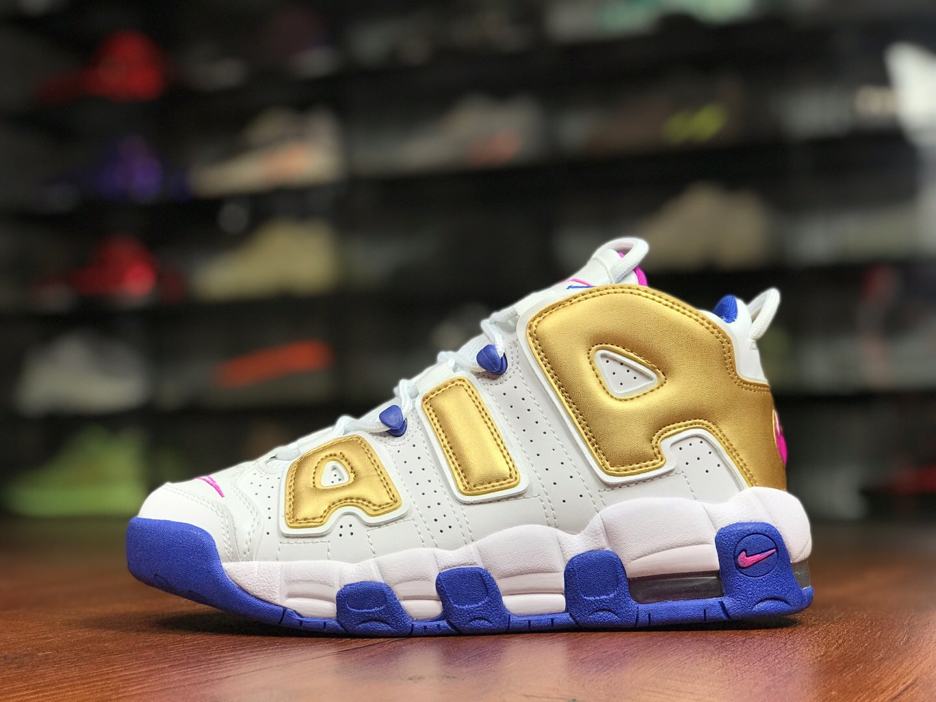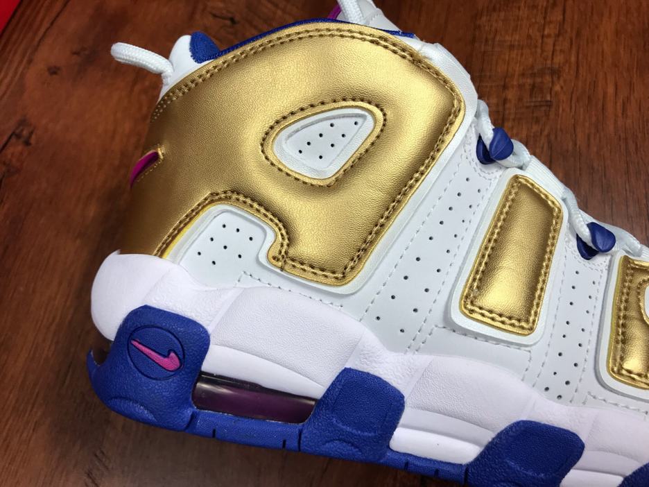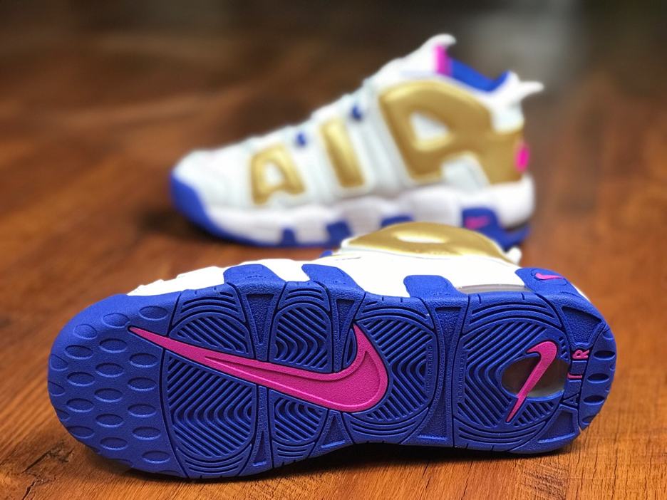 Заказать поиск кроссовок Nike Air More Uptempo Peanut Butter & Jelly GS с бесплатной доставкой. Подростковая модель Nike Air More Uptempo Peanut Butter & Jelly GS подчеркивают свою фирменную надпись «AIR» за счет отделки металлическим золотом. Белая основа обуви дополнительно подчеркнута подошвой Racer Blue и системой шнуровки, с цветом Fuchsia Blast на внутренней подкладке и логотипами по всей модели. Эти подростковые кроссовки имеют частично герметичные воздушные и эластичные шнурки. Ознакомьтесь с подробными фотографиями и закажите эту расцветку Nike Air More Uptempo Peanut Butter & Jelly GS в розничных магазинах или в сервисе Slamdunk