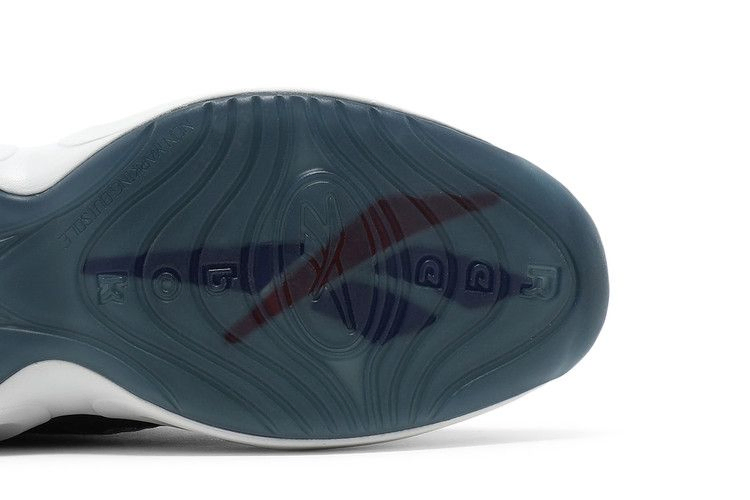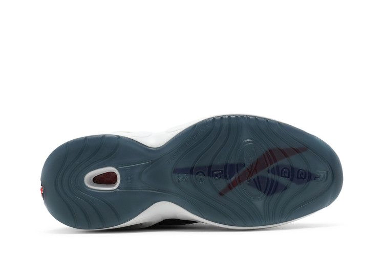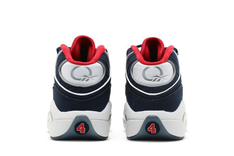 Reebok Question Mid Big Kid 'USA' - это патриотическая расцветка дебютной фирменной обуви Аллена Айверсона. Верхняя часть изготовлена из синтетического нубука темно-синего цвета с контрастной белой кожей на усиленном мыске и язычке пятки, с тисненым брендингом Question. Логотип Reebok Vector, выполненный в темно-красных тонах и украшенный серебристой вышивкой, украшает четверть и язычок. Верхняя часть установлена на белую промежуточную подошву из ЭВА с видимой амортизацией Hexalite. Под подошвой из темной резины на пятке видна цифра "4" - номер майки команды США Айверсона на Олимпийских играх 2004 года в Афинах.