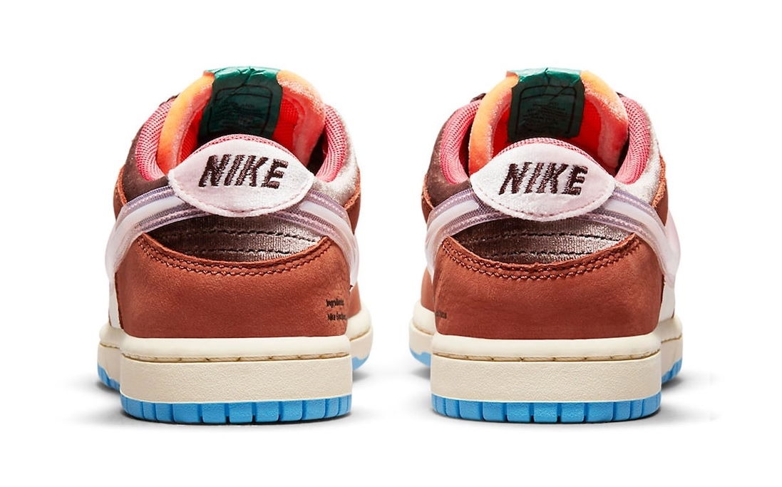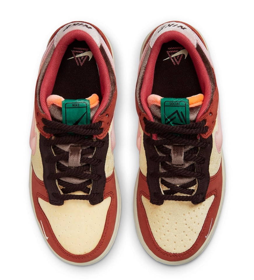 Social Status x Nike Dunk Low PS сделаны из велюра и кожи с полупрозрачными синтетическими «свушами». Дополняют дизайн логотипы Social Status и Nike на язычковых бирках и стельках, а также мини-галочка на носке и список ингредиентов, отображаемый на медиальной стороне, с надписью «Nike Sportswear, Social Status». Это версия в подростковой PS размерной сетке.