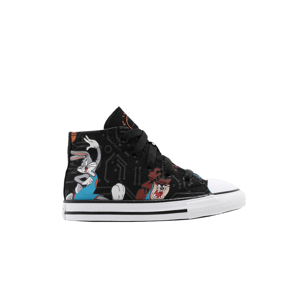 Converse Chuck Taylor All Star High TD 'Tune Squad' празднует выход фильма "Space Jam: A New Legacy" в уменьшенном варианте для маленьких ножек. Верхняя часть из черного канваса украшена тональным принтом в виде печатной платы и красочной графикой в виде анимационного состава фильма, включая Багза Банни, Лолу Банни, Даффи Дака, Твити Берда, Марвина Марсианина, Таза и других. На язычке красуется брендинг Tune Squad, а круговая нашивка All Star украшает медиальную лодыжку. Верхняя часть кроссовка опирается на белую резиновую подошву с контрастными черными полосками.
