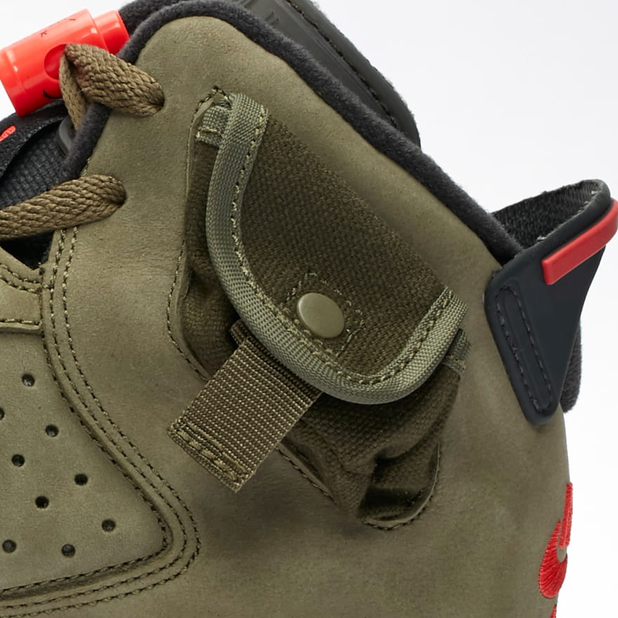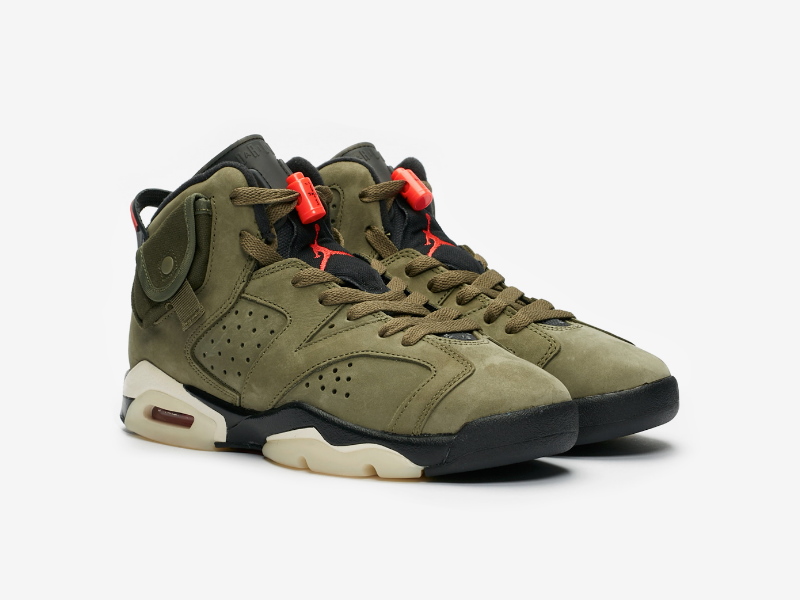 В октябре 2019 года рэпер Трэвис Скотт был приглашен поставить свой фирменный штамп в стиле милитари на культовые кроссовки Air Jordan 6 Retro GS. Эта детская версия имеет верх из оливкового нубука с вышитым инфракрасным логотипом на пятке, светоотражающими деталями и потрепанным язычком. Ранее на модели Air Jordan 1 Скотта было видно, что на щиколотке есть потайной карман. Светящаяся в темноте резиновая подошва завершает дизайн.- Цвета: Medium Olive/Black/Sail/Univeristy Red