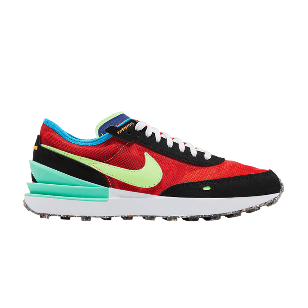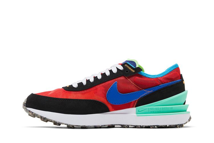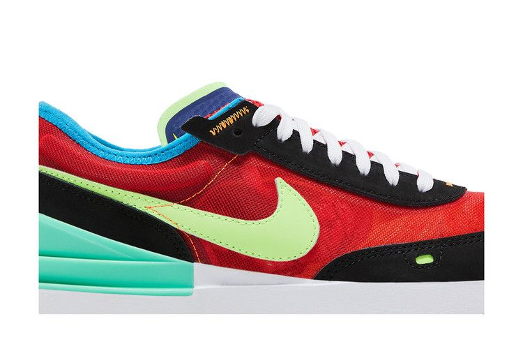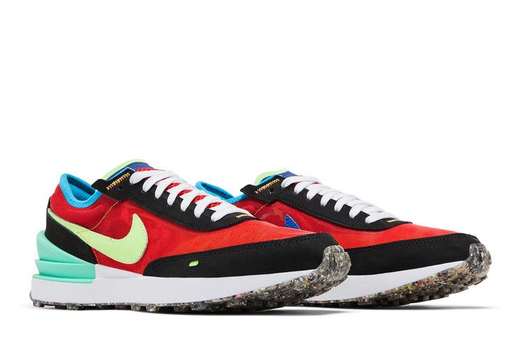 Созданные для больших детей, Nike Waffle One GS "Exeter Edition" получили свое название от первой американской фабрики Nike, открытой в Эксетере, штат Нью-Гэмпшир, после того, как ее облюбовал продавец Джефф Джонсон, первый официальный сотрудник компании. Силуэт, вдохновленный ретро, имеет красный полупрозрачный сетчатый верх с контрастными черными накладками из нубука и несовпадающими кожаными логотипами Swooshes королевского синего и Ghost Green. Кроссовки стоят на двухслойной подошве из пеноматериала, стабилизированной мятно-зеленым TPU-клипсом на пятке и укрепленной подошвой из резины с пятнистой поверхностью, на 15% состоящей из Nike Grind.