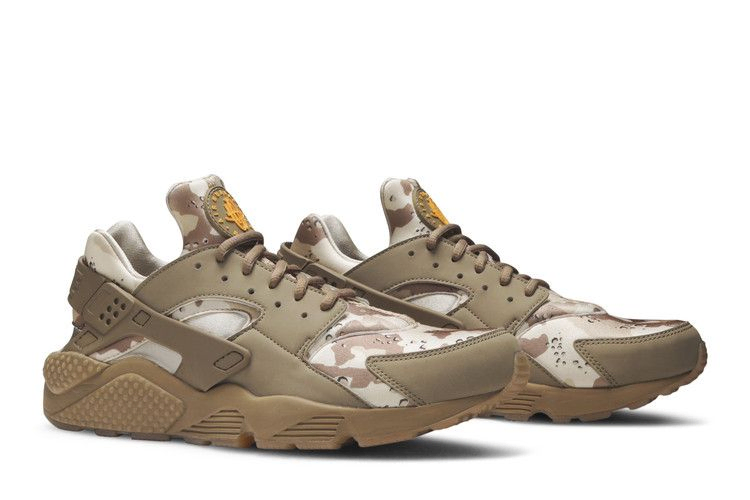 В кроссовках Nike Air Huarache 'Camo' использованы детали дизайна силуэта 1991 года и обновлен дизайн в военном стиле. Выпущенная в августе 2018 года в составе пакета из двух кроссовок, эта модель Huarache имеет неопреновый верх, одетый в камуфляж Desert Ore. Ботинок укреплен системой шнуровки и пяточной клипсой для стабилизации. Подошва из каучуковой резины оснащена амортизирующей подушкой из пеноматериала с вафельным протектором.