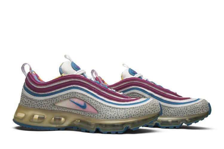 Модель Union x Air Max 97/360 'One Time Only' сочетает в себе верхнюю часть Air Max 97 и оснащение Air Max 360. Модель выполнена в той же расцветке, что и Air Force 180 из Nike's 2005 Clerks Pack, и имеет волнистые линии Rave Pink и Military Blue на верхней части, серый слоновий принт, обвивающий основу, и многоцветный графический узор на внутренней подкладке.