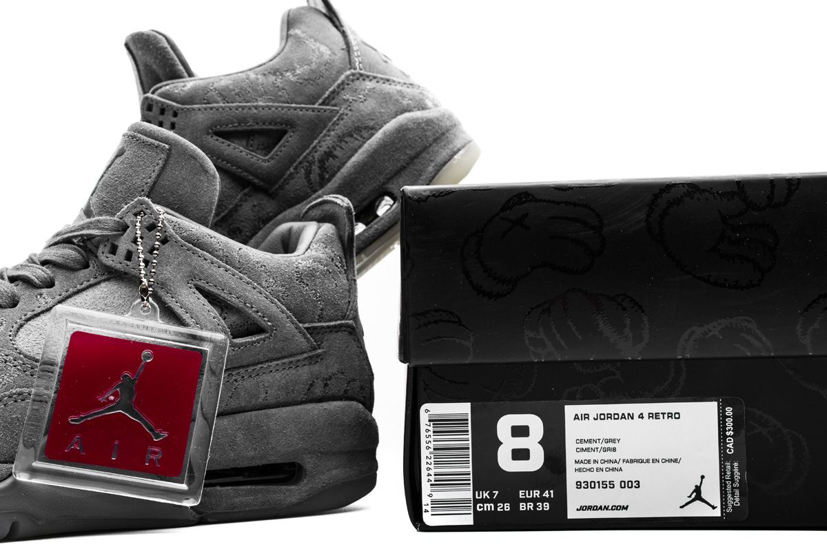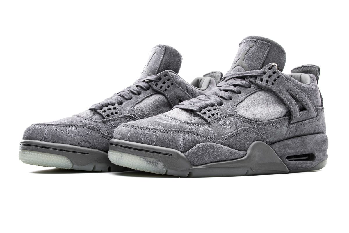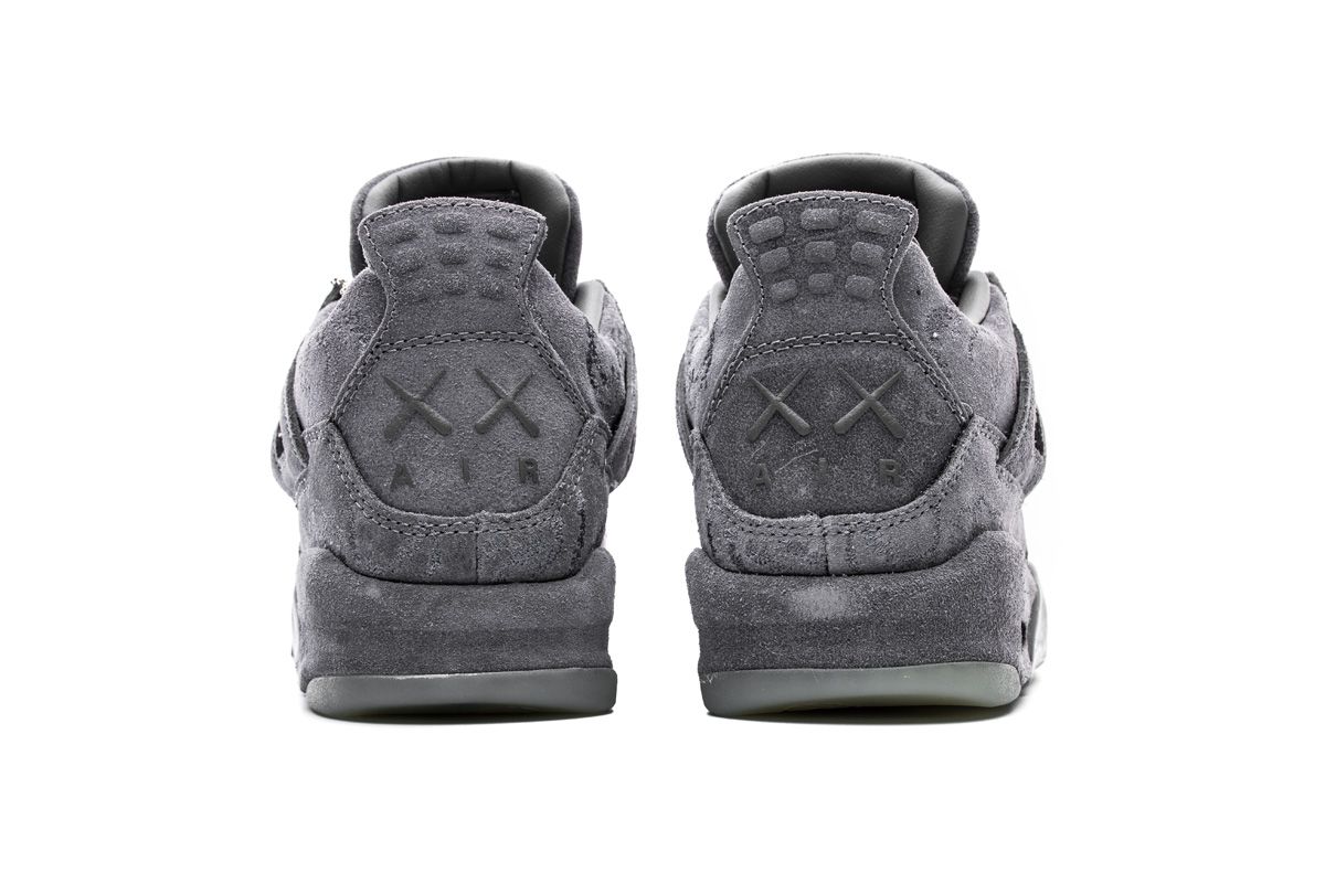 KAWS x Air Jordan 4 Retro - это сотрудничество между брендом Jordan и уличным художником KAWS из Бруклина, a.k.a. Брайан Доннелли. Дизайн удаляет традиционные пластиковые акценты силуэта и одевает весь верх в серый замш высшего качества. Кроссовки также имеет фирменный стиль KAWS ’XX на пятке. Обувь была выпущена капсульной коллекцией, которая включала куртку, толстовку с капюшоном, футболку и шляпу в марте 2017 года. Ажиотаж был настолько большим для этого выпуска, что в магазине Патта в Лондоне была вызвана полиция и падал сайт Донелли.- Цвета: Cool Grey/White