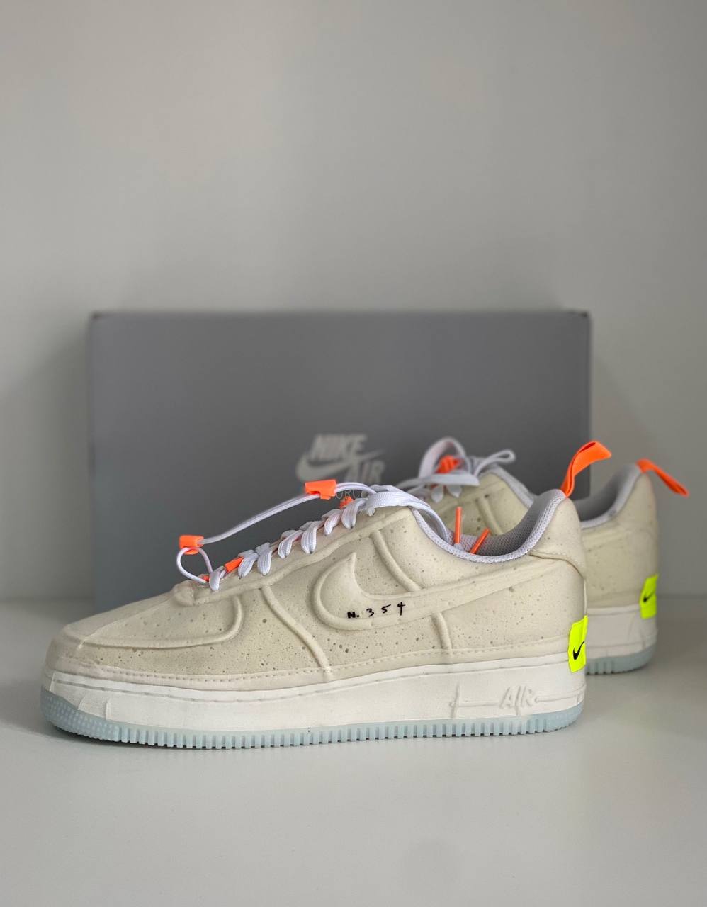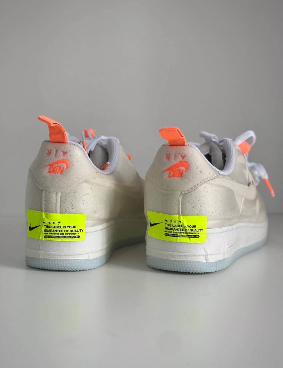 Кроссовки Nike Air Force 1 Low Experimental Sail преобразуют классический силуэт в интересный облик, подчеркнутый глянцевым эффектом вакуумной герметизации по всей цельной верхней части и мидсоли. Традиционные шнурки соединяются декоративным шнурком, который накладывается поверх серого язычка из вспененного материала. Элементы бренда включают надпись «N.354» на боковом свуше, а также перевернутый логотип Nike на язычке и неоново-зеленую этикетку, гарантирующую качество. Подошва из резины для надежного сцепления под ногами завершает образ.- Цвета: White/Sail/Atomic Orange/Black
