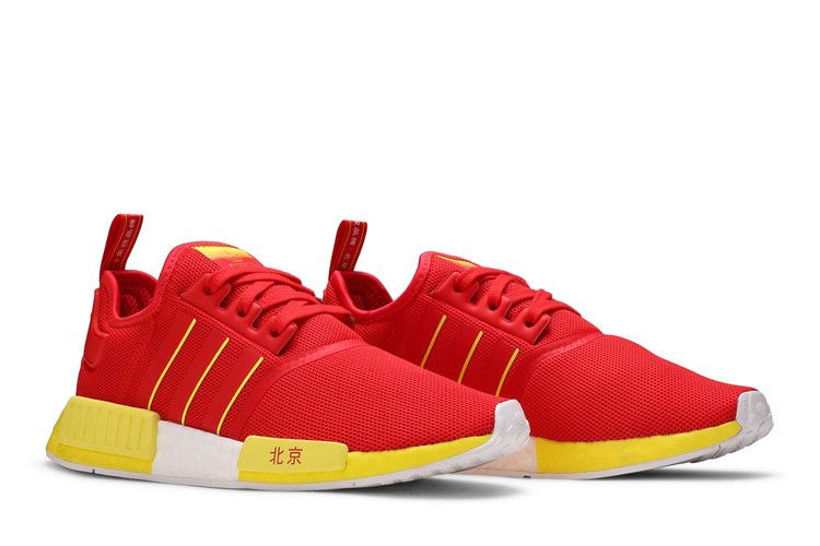 Модель adidas NMD_R1 "Beijing", выпущенная в рамках городской серии бренда, выполнена в двухцветной цветовой гамме, вдохновленной китайским флагом. Красный трикотажный текстильный верх облегает ногу, как носок, а на пятке имеется завязка для удобства надевания и снятия. Контрастный ярко-желтый цвет присутствует на приваренном язычке и фирменных трех полосках. Желто-белая промежуточная подошва Boost с желтыми заглушками из ЭВА.