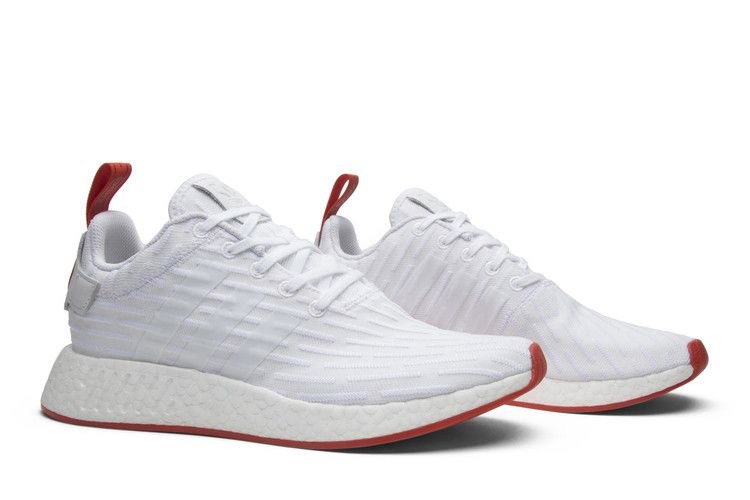 Модель NMD_R2 PK "Running White" имеет полностью белый верх из материала Primeknit с тональным брендингом в виде трех полос, белую кожаную нашивку на пятке и белую промежуточную подошву boost. Кроссовки, выпущенные в апреле 2017 года в черном цвете, также имеют красную подошву, пятку и межподошву из EVA.