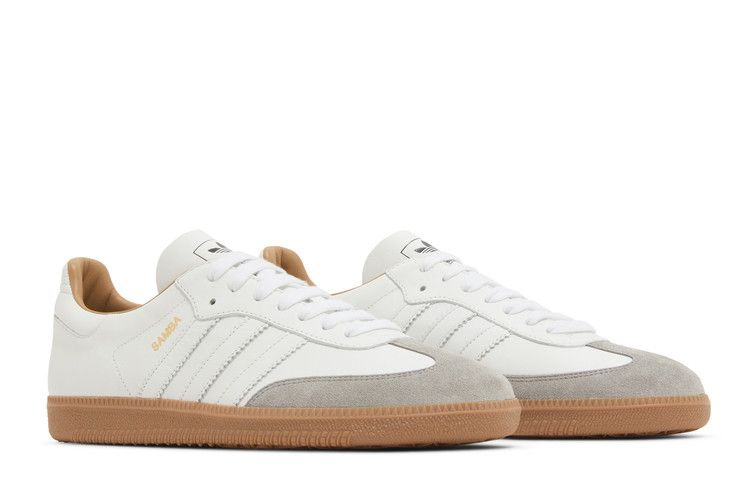 Модель adidas Samba Made in Italy "White Gum" вдохновлена итальянскими туфлями. Верх из белой кожи с контрастной накладкой из серой замши на носочной части. Детали включают тональные зубчатые полоски, подкладку из кожи цвета загара и надпись "SAMBA", выполненную золотой фольгой на боковой стороне. Низкопрофильная подошва из прочной резины поддерживает кроссовки.