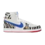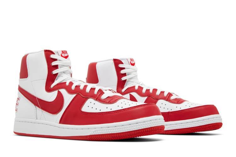 Nike Terminator High 'St. John's' демонстрируют классический двухцветный колорблокинг, вдохновленный серией Nike 'Be True to Your School' 1985 года. Ретро-баскетбольная модель выполнена из гладкой кожи и имеет белый цвет с контрастными красными акцентами на передней части стопы, накладке на глаза, фирменном логотипе Swoosh и заднике. На каждой пятке красным шрифтом напечатан фирменный знак Nike. Верхняя часть кроссовок установлена на прочную резиновую подошву с белыми боковыми стенками и алой подошвой.- Модель: Nike Terminator