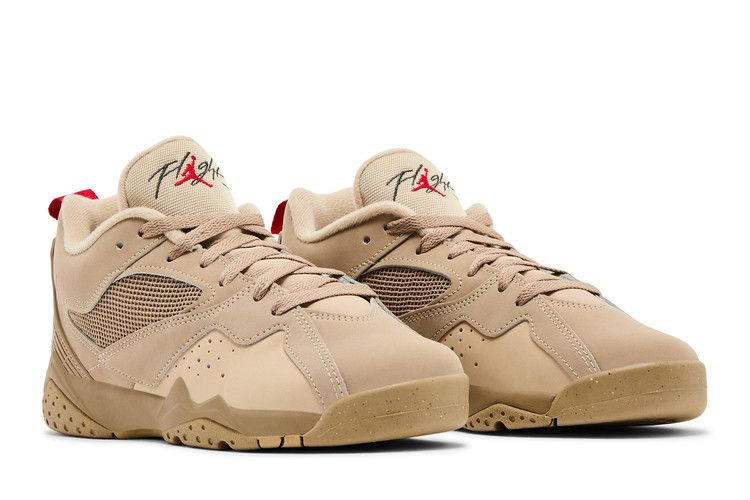 Модель Jordan MVP 92 GS "Desert Camo" вдохновлена моделью Air Jordan 7, а ее верхняя часть из многослойной кожи выполнена в тональном оттенке загара. Дышащая сетка использована на четверть панели, а перфорированные детали украшают медиальную и латеральную стороны передней части стопы. На пятке прикреплена вкладка из тесьмы огненно-красного цвета, сочетающаяся с брендингом Jumpman и тисненым логотипом Nike Air, украшающим заднюю часть пятки. Зазубренные детали, напоминающие о модели AJ7, украшают подошву из пеноматериала цвета загара.