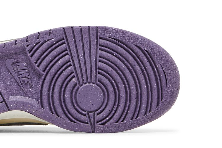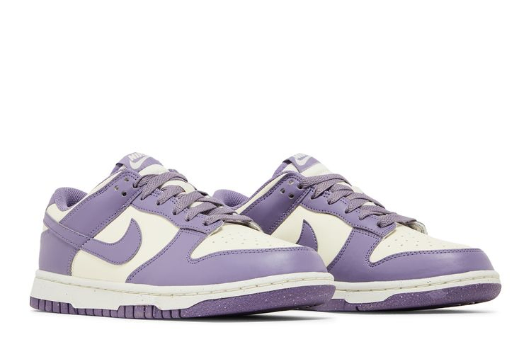 Женские кроссовки Nike Dunk Low Next Nature "Daybreak", изготовленные с использованием не менее 20 % переработанного сырья, имеют верх из искусственной кожи, основу из белой ткани со светло-фиолетовыми накладками и подогнанный по цвету Swoosh. Брендинг Nike украшает тканый язычок и задник, а логотип Nike Sunburst украшает носок. Низкие кроссовки установлены на традиционную подошву, подчеркнутую прошитыми боковыми стенками и внутренним клином из пеноматериала для легкой амортизации.