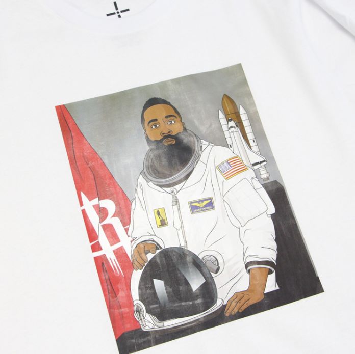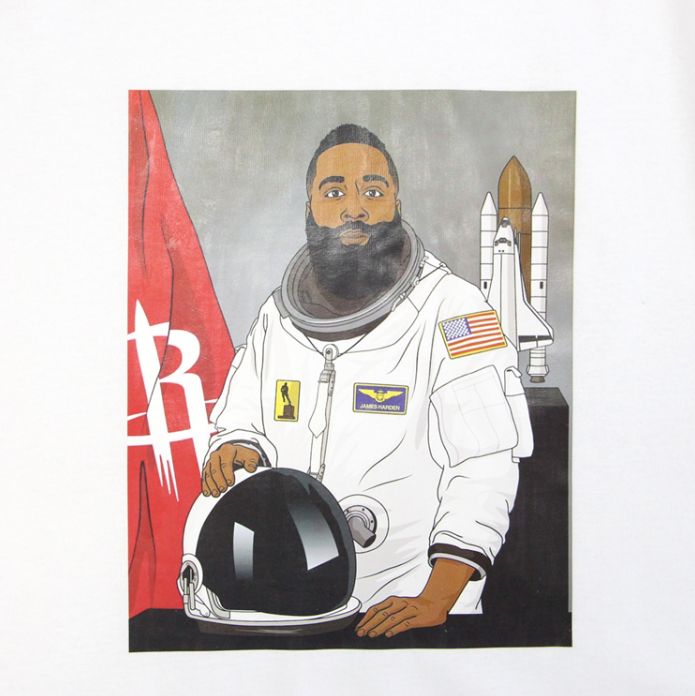 Стильная футболка из мягкого хлопка с принтом на груди Джемса Хардена в скафандре. Белая расцветка, также есть в чёрном цвете.- Машинная стирка
