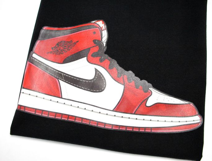 Стильная футболка из мягкого хлопка с принтом классической модели кроссовок Air Jordan 1 в расцветке Chicago Bulls. Чёрная футболка, также есть в белом цвете.- Машинная стирка
