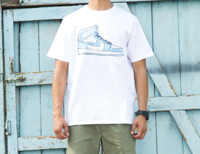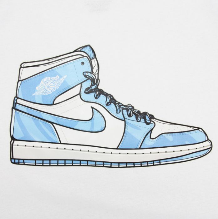 Стильная футболка из мягкого хлопка с принтом классической модели кроссовок Air Jordan 1 в расцветке UNC. Белая футболка, также есть в чёрном цвете.- Машинная стирка