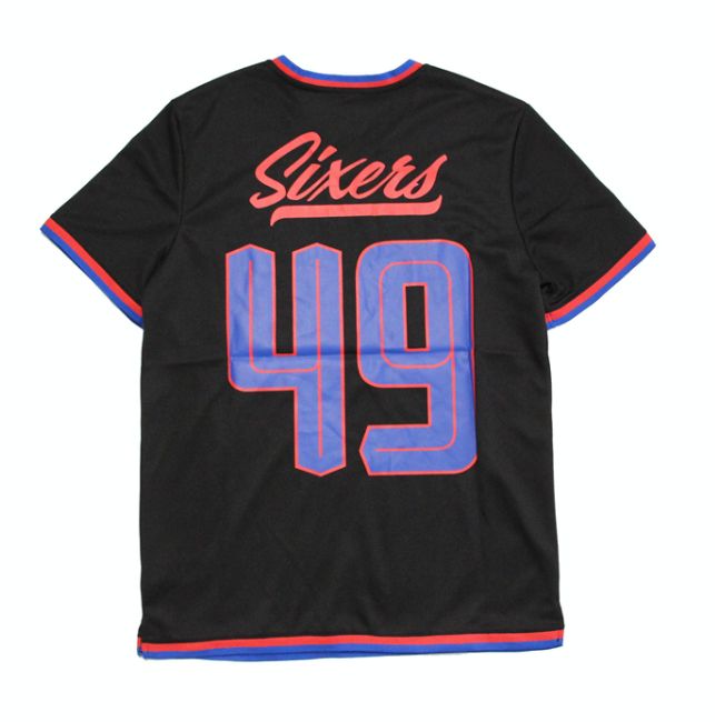 Стильная футболка из легкого и мягкого материала для фанатов команды Филадельфия Сиксерс. Чёрная расцветка с вышитым логотипом на груди и номером 49. На спине винтажная надпись прозвища 76ers, крупно номер 49.- Машинная стирка