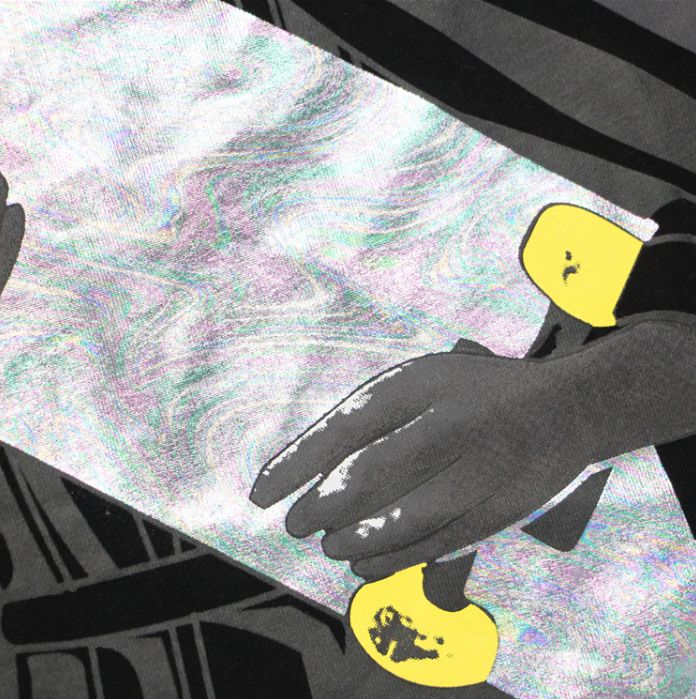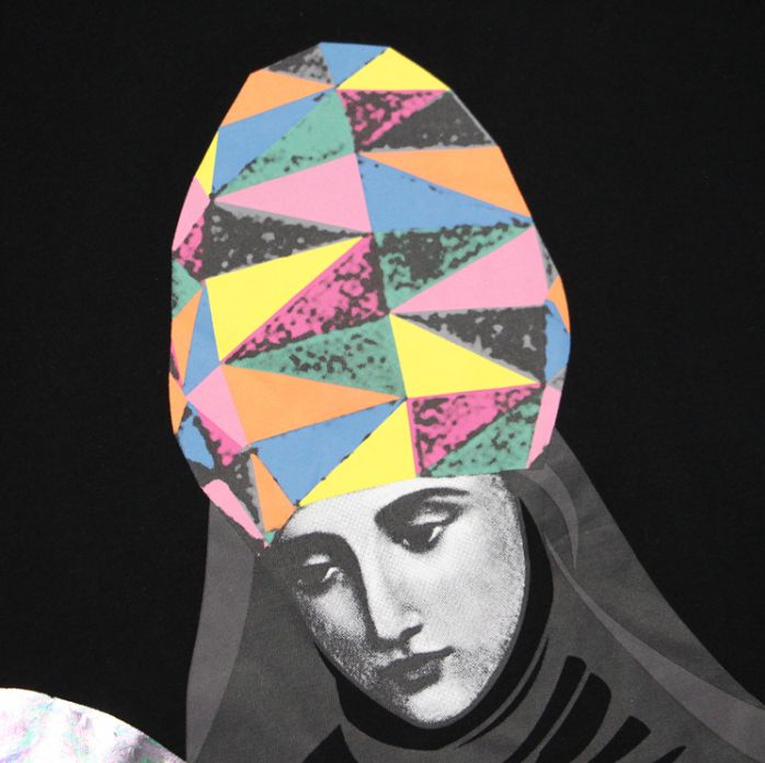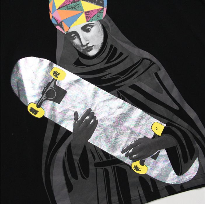 Стильная свободная футболка из мягкого хлопка с принтом святой женщины со скейтом. Чёрная расцветка футболки, также есть в белом цвете и сером цвете.- Машинная стирка