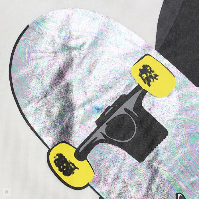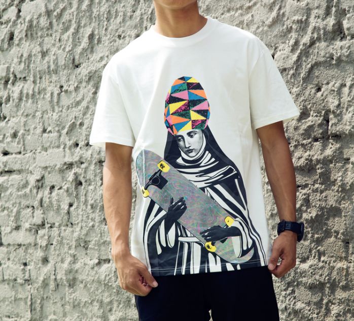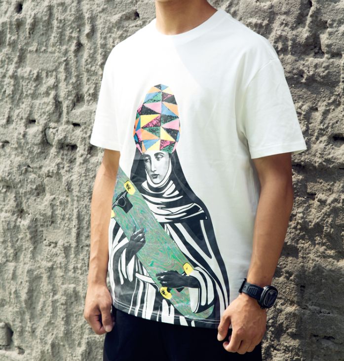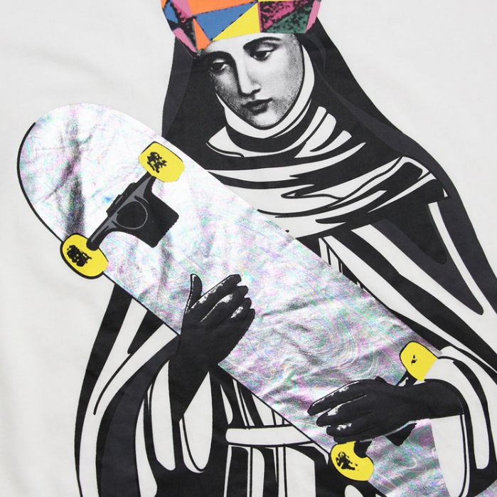 Стильная свободная футболка из мягкого хлопка с принтом святой женщины со скейтом. Белая расцветка футболки, также есть в чёрном цвете и сером цвете.- Машинная стирка