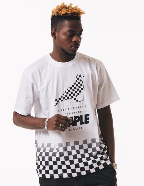 Футболка с принтом голубя - известным символом бренда Staple Pigeon! Футболка прямая свободного кроя из 100% хлопка, мягкий материал, удобно носить. Уличный стиль - подходит мужчинам и женщинам, в белой расцветке с изображением брендового голубя на груди в шахматном градиенте.- Размер: S - XL