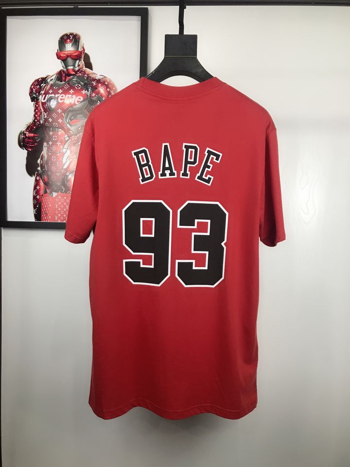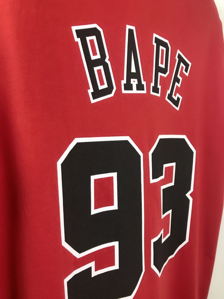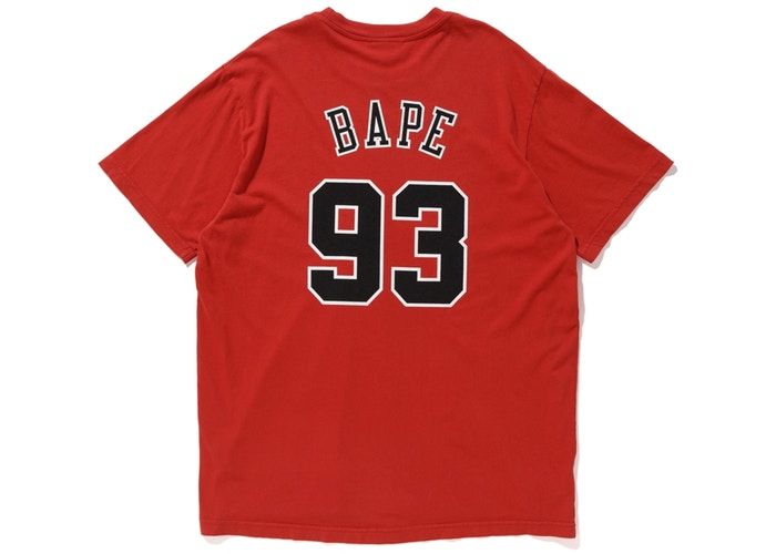 Красная футболка легендарной коллаборации брендов BAPE x Mitchell & Ness и НБА. На груди принт Bulls и логотип Бэйп, исполненный термопечатью с номером 93 и неймингом на спине.
