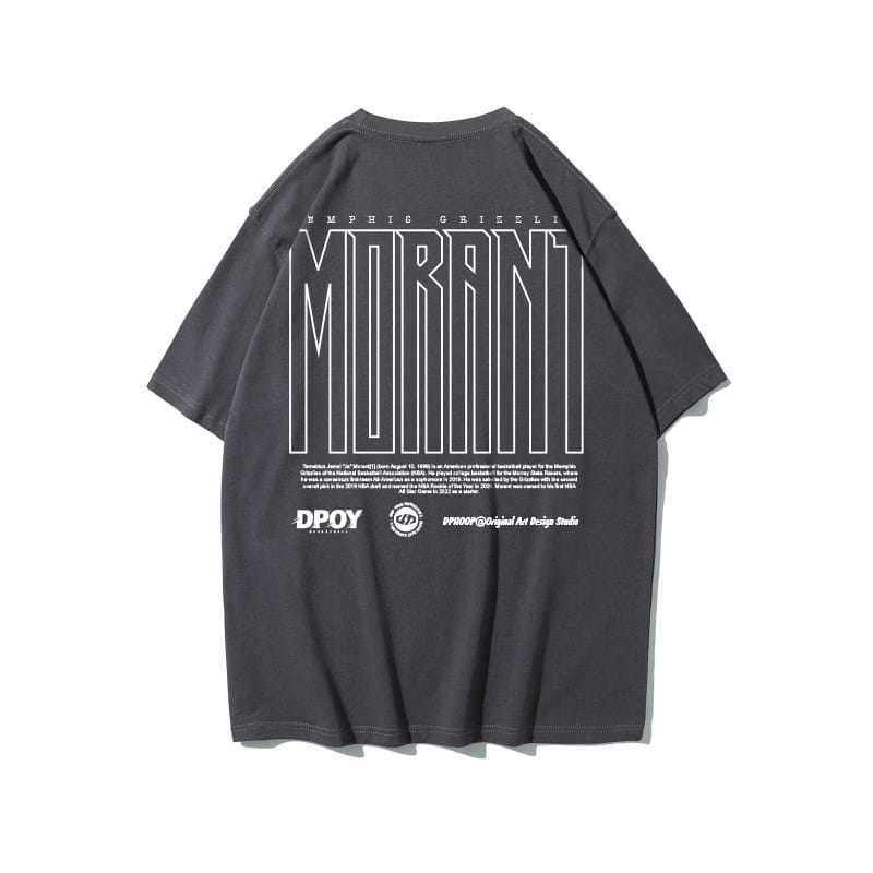 Футболка DPOY Grizzlies Morant two-sided Print T-shirt изготовлена из плотного хлопка и имеет свободный крой с круглой горловиной. Удобная темно-серая футболка прекрасно подходит для повседневного использования и занятий спортом. На переднюю часть футболки нанесен цветной принт с изображением игрока Ja Morant, а на спине есть посвященный ему текст.