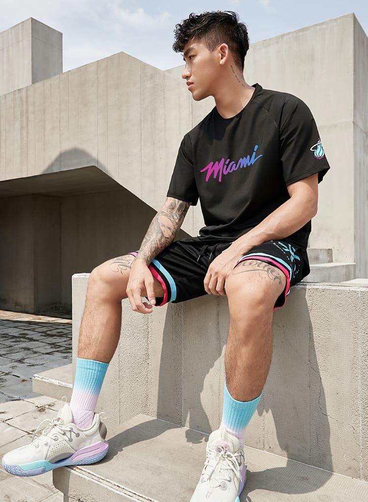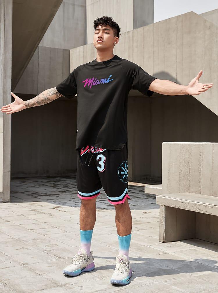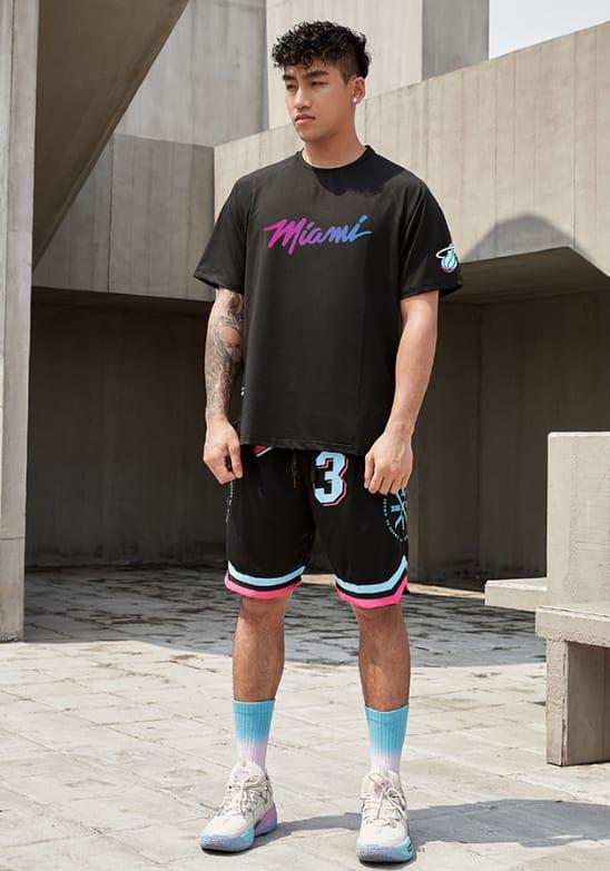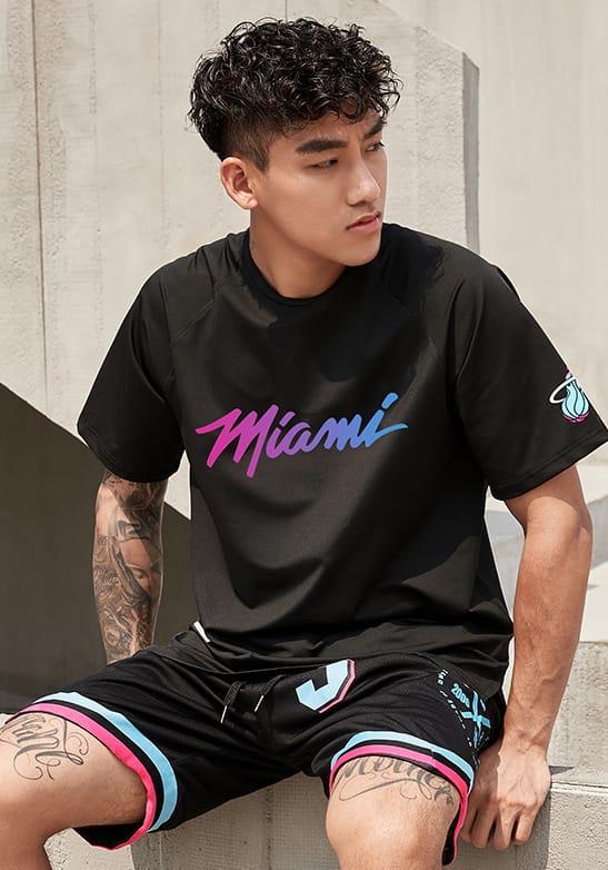 Футболка Ehot Miami Neon Gradient Black T-Shirt черного цвета изготовлена из комфортного материала для спортивной одежды. Передняя часть футболки украшена яркой надписью Miami с розово-голубым градиентом, а на рукаве есть символика клуба Miami Heat. Футболка имеет свободный и удобный крой.
