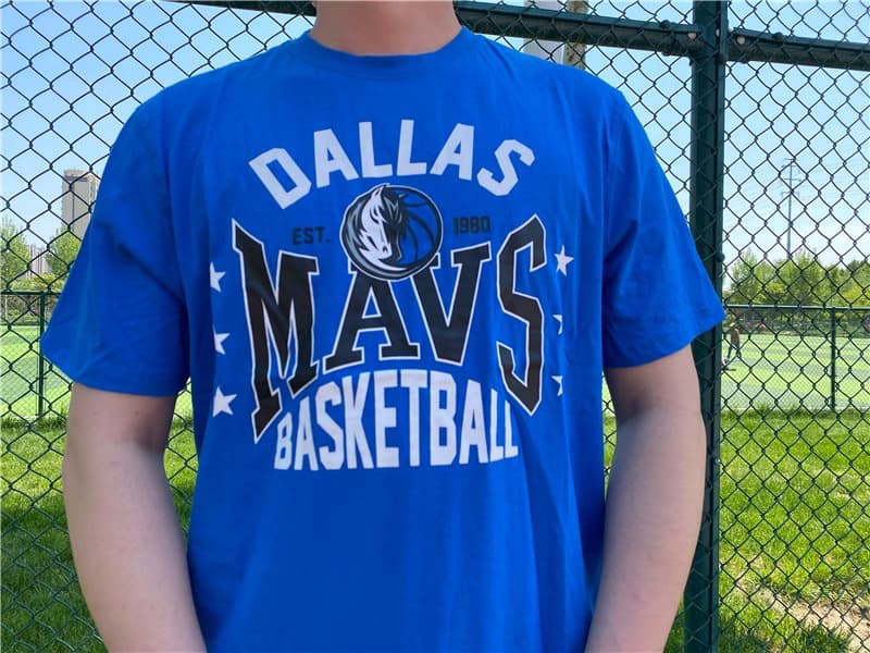 Футболка Main Squeeze NBA Dallas Mavericks Blue T-Shirt голубого цвета с белыми акцентами обладает свободным фасоном с круглым вырезом. На передней части располагается принт в цветах Мэвс с годом основания клуба. Комфортная футболка прекрасно подходит для тренировок, так как не ограничивает движений и изготовлена из быстросохнущего материала.