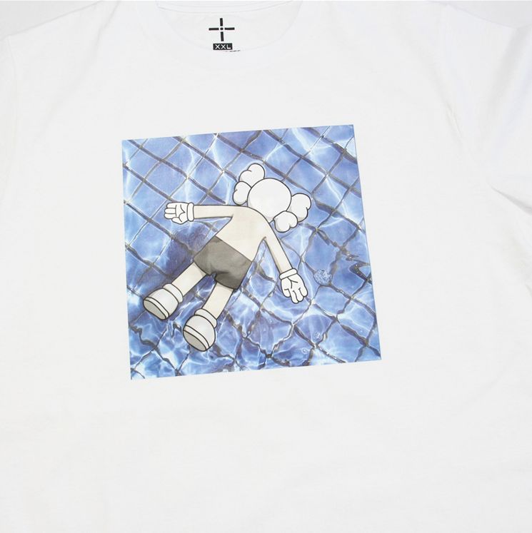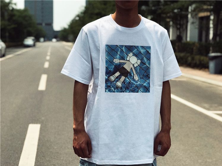 Футболка из мягкого хлопка в белой расцветке. На груди принт фигуры дизайнера KAWS, плавающим в бассейне вниз головой. Есть чёрная расцветка. Всего 100 штук!- Машинная стирка