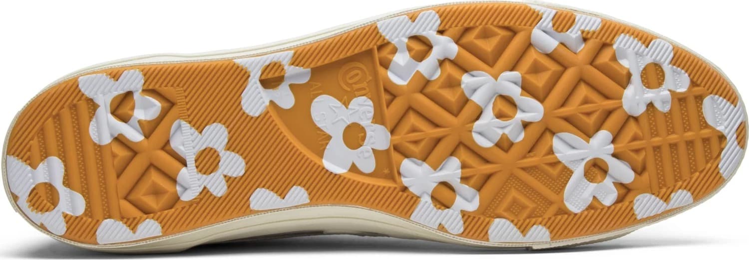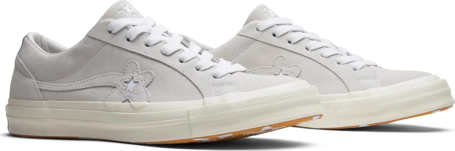 В отличие от других цветовых решений коллекция Converse Golf le Fleur 'Mono' от апреля 2018 года, это полностью белое издание имеет полностью монохромный верх. Обновленная модель One Star, разработанная в сотрудничестве с Tyler, the Creator, имеет отделку Off-White по всему замшевому верху и соответствующую промежуточную подошву. Контрастный цвет присутствует только на подошве: подошва покрыта оранжевым цветом и украшена белым цветочным принтом.- Цвета: White